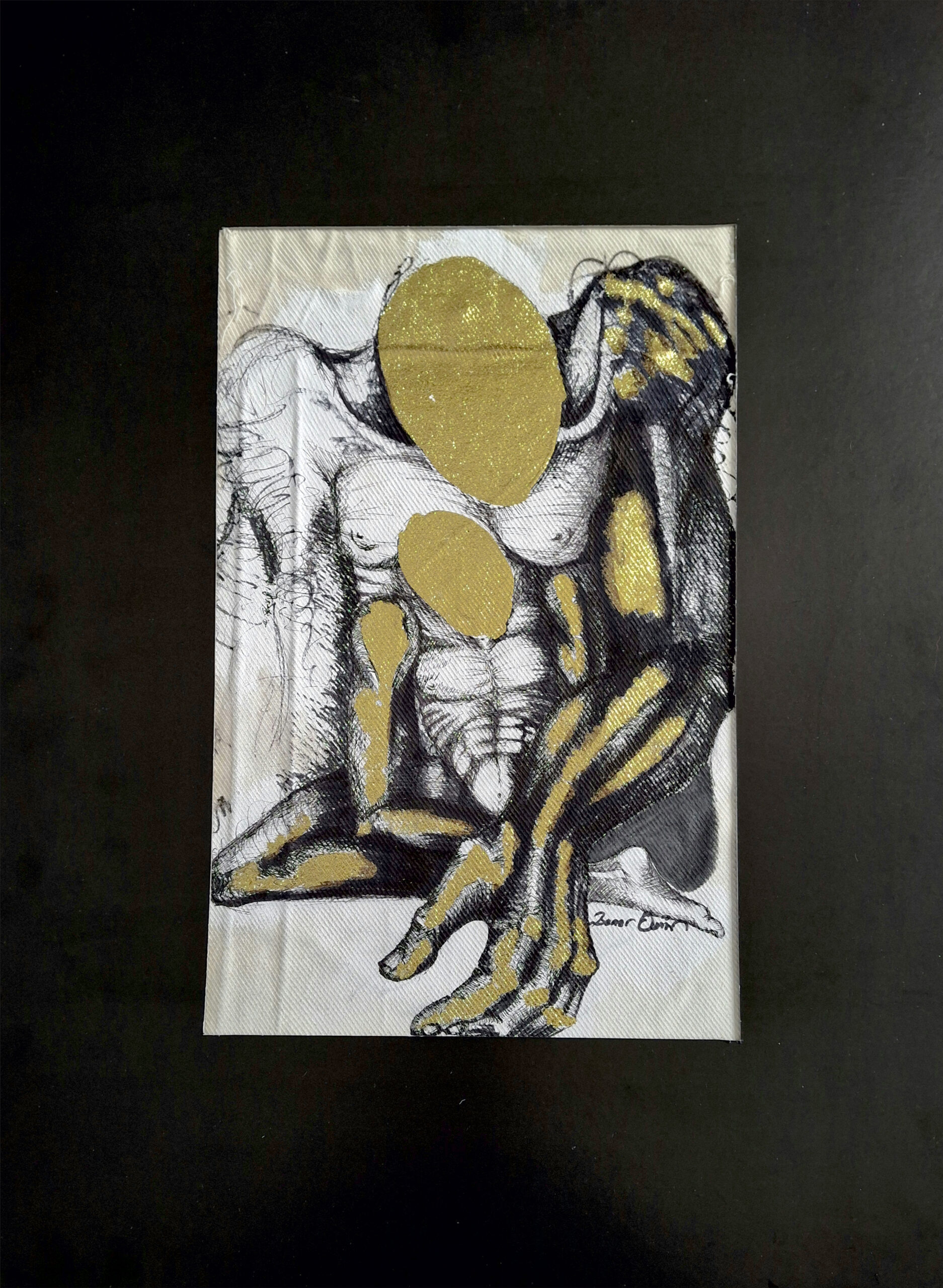 marker black ink, gold paper on canvas